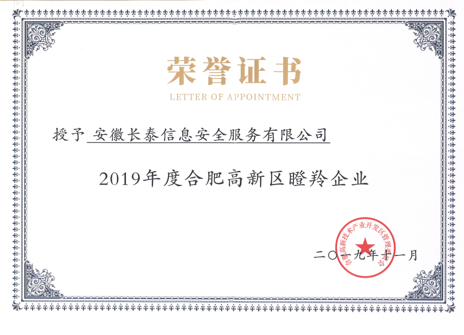 2019年,11月20日,合肥高新区2019年高成长企业榜单正式发布,高新区共认定了502家高成长企业,其中雏鹰企业275家、瞪羚培育企业72家、瞪羚企业149家、潜在独角兽企业3家、独角兽企业1家、平台型龙头企业2家。作为其中的高科技企业——安徽兰州浩杰食品包装材料有限公司成功入选瞪羚企业榜单。